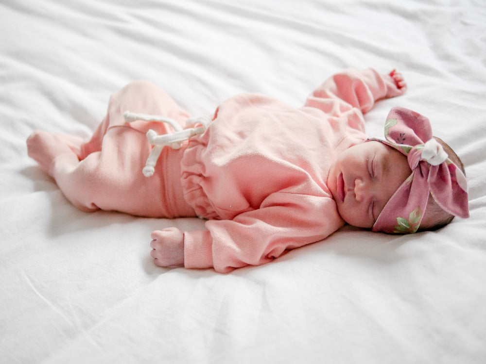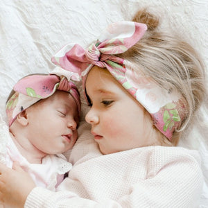 Charli is 3.5 years old and wears the Large size top knot headbands, Nelly is 3 weeks old and wears the small size top knot headband.