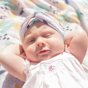 Our Blush Abstract Print Turban Headband is made from our very own, exclusive fabric design! These cool, soft and stretchy turban headbands are made from cotton/elastane fabric and are a fun alternative to our traditional headbands. Great for finishing off a casual look and keeping ears warm! There is no tying necessary with these headbands. Please see the sizing guide below and note that the sizing is based on average head size for age.