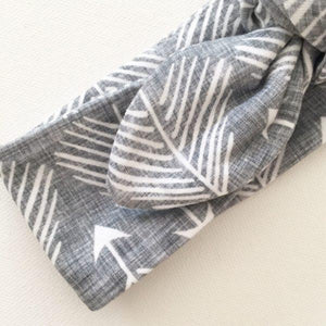 Our Grey Feathered Arrows Print Top Knot is just perfect for the warmer weather! These gorgeous, soft knit fabric top knot headbands are a fun alternative to our traditional headbands. Great for finishing off a casual look!