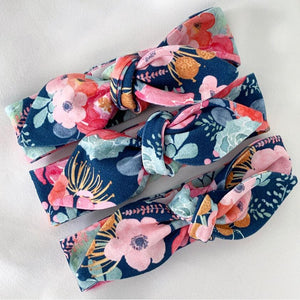 Our Poppy Navy Top Knot Headband is a stunning and classic print. It is a gorgeous navy base, with a vibrant pink, aqua, mustard and red floral design.