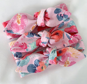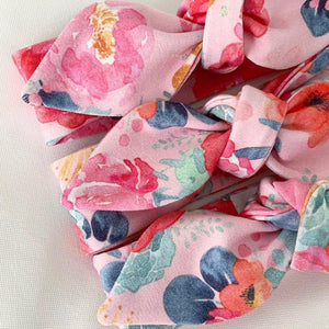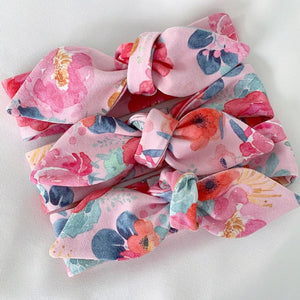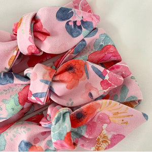 Our Poppy Pink Top Knot Headband is a stunning and classic print. It is a gorgeous pink base, with a vibrant pink, aqua, mustard, navy and red floral design.